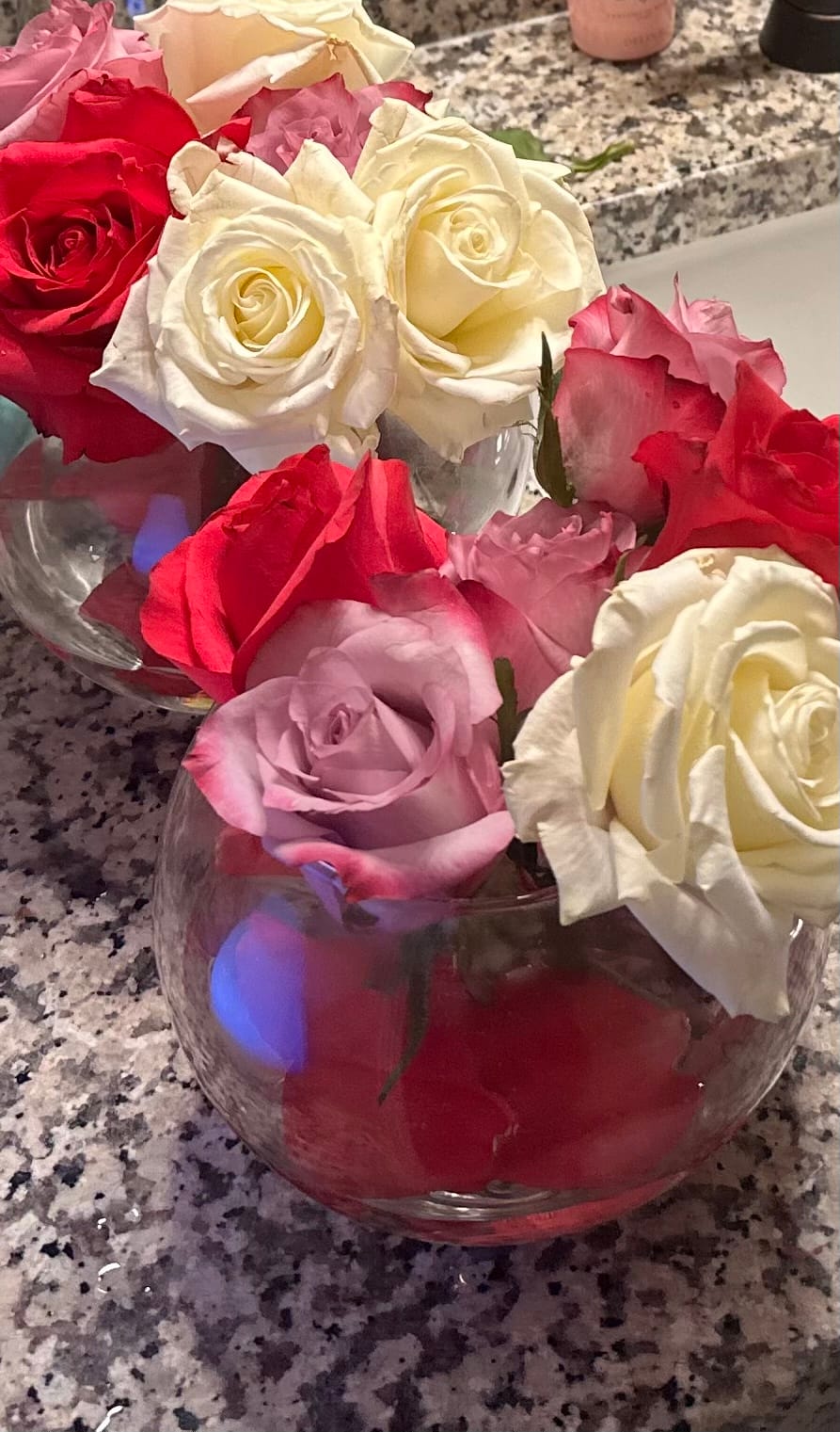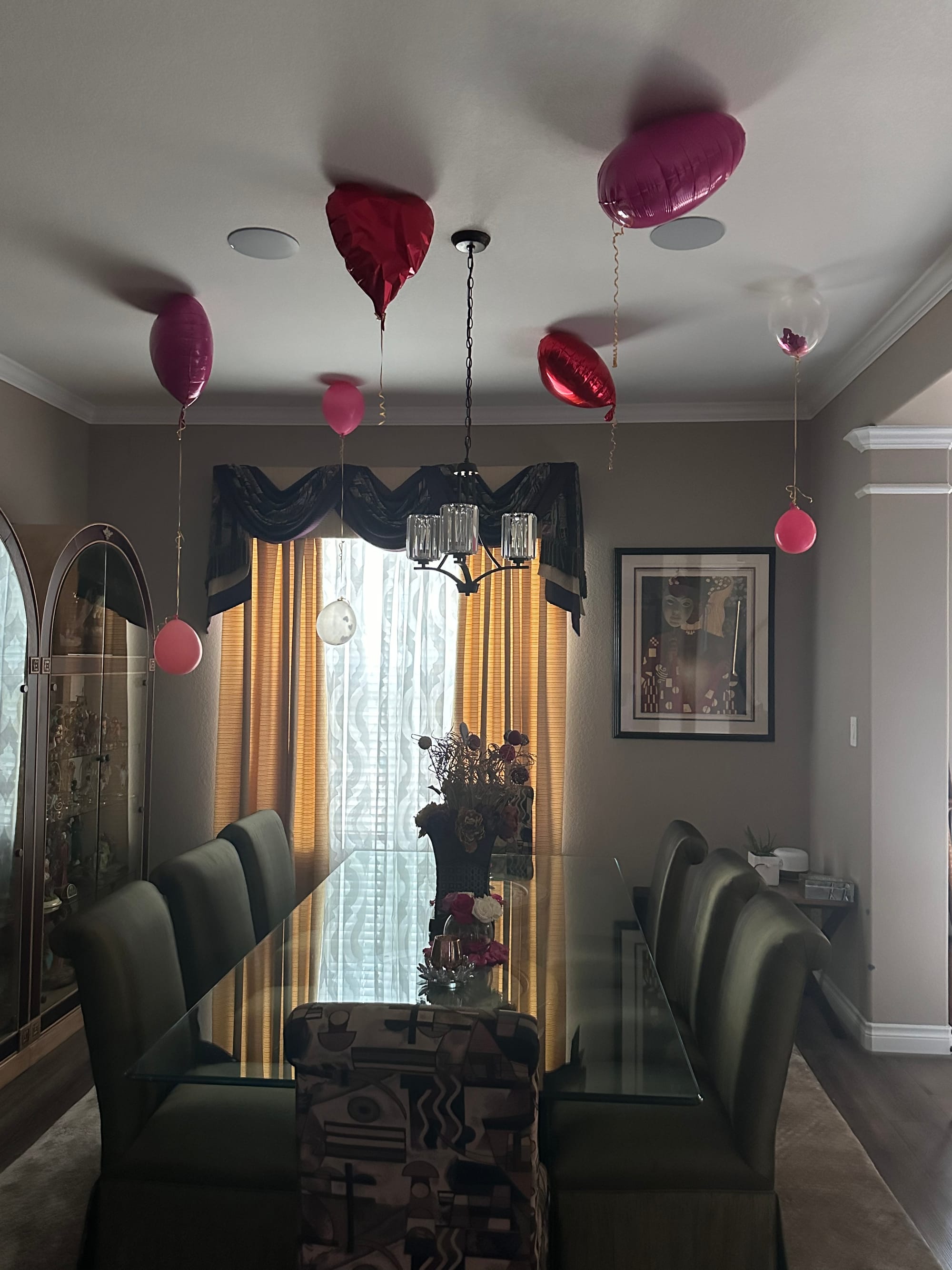 I picked up the balloons the day before the party and made the flower arrangements for the table from different colored bouquets of roses i bought and fresh rose petals.