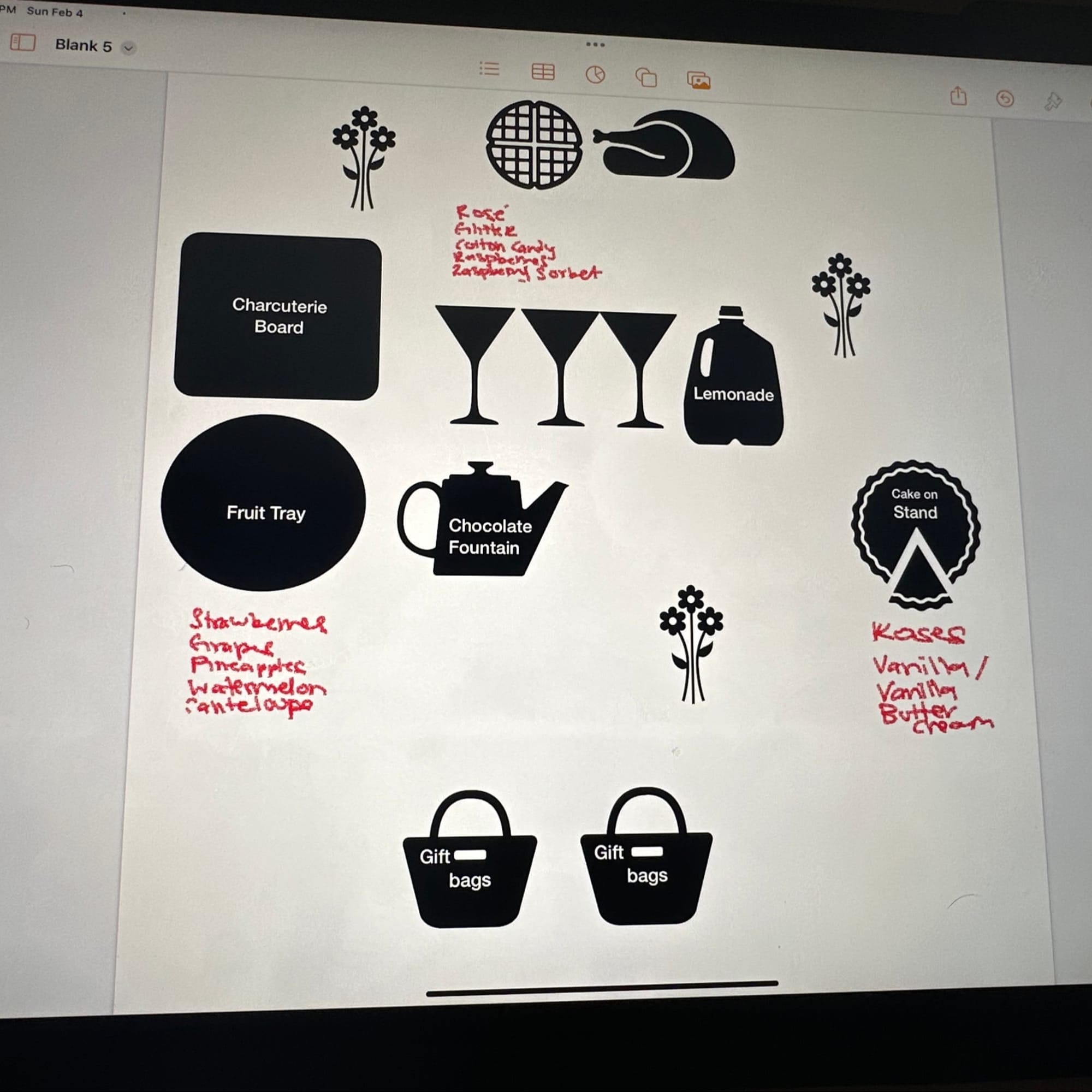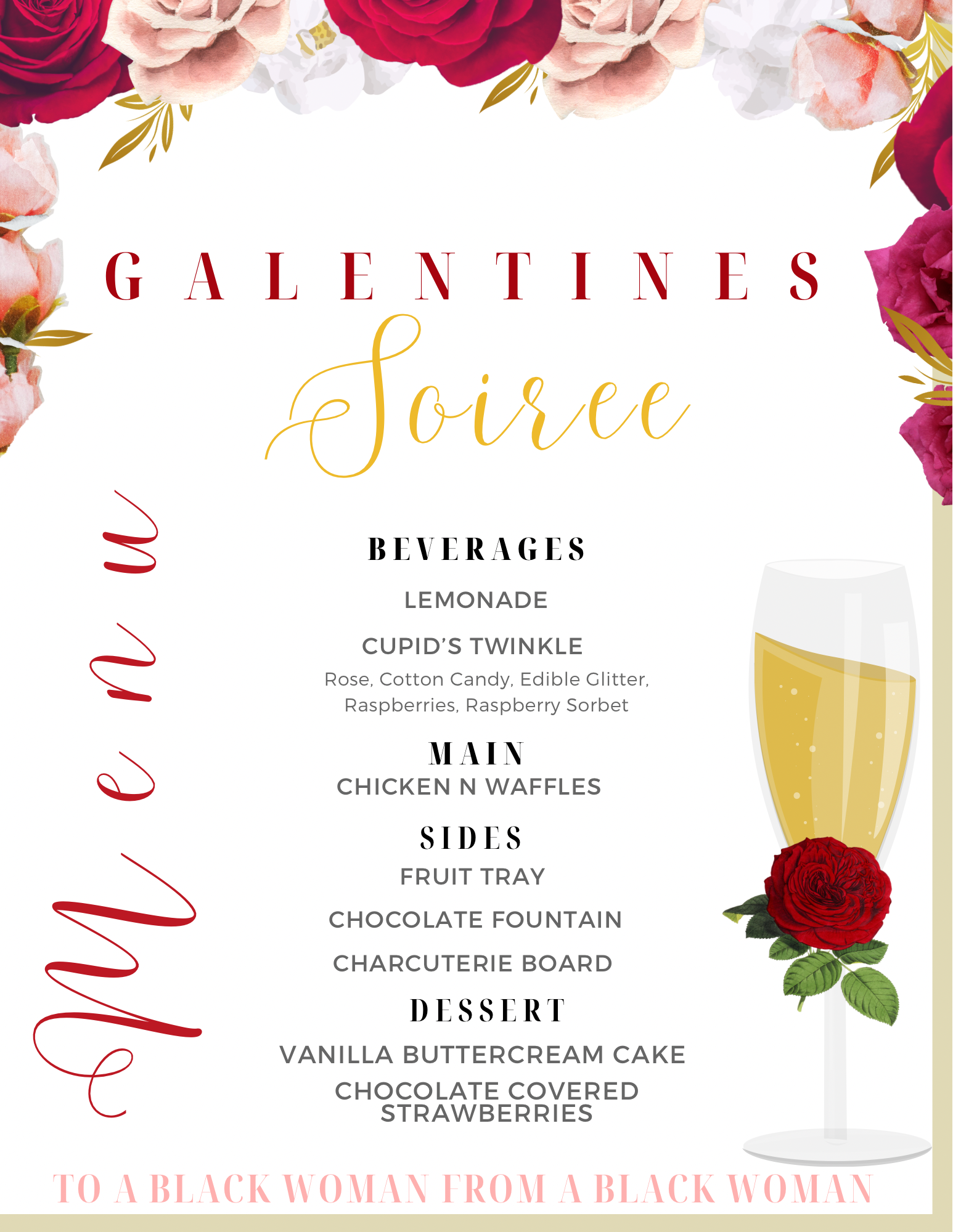 I had this idea not long after New years that I wanted to host a galentines.(Sidenote, I have never hosted one but I love the challenge). I texted my mom an idea of what I wanted to do with the menu and decorations using Pages on my Ipad. I wanted to celebrate the black women in my life and allow us to take up space for a few hours.